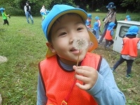 午前中は森の散策をしました。森の館の近くにあるコナラの木を見て、施設の方(きのっち)に「何か前と変わってない?」と聞かれると「お花がなくなってる」「丸い実がついてる」と口々に変化を伝えていました。「この丸いのはどんぐりの帽子だよ。次来る時にはどんぐりになっているかもね」と教えてもらい楽しみにしていました。