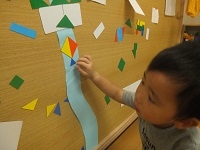 トップ > お知らせ > 2歳児 いろんな物作れたよ! ~マグネット遊び~ 園からのお知らせ 2022.08.05 ブログ 2歳児 いろんな物作れたよ! ~マグネット遊び~ 壁に貼っているイラストや〇△□の形の絵を見て、紙の上から「このかたち いっしょ!」「同じのできた」 など言い同じ形になっていることを楽しんでいます。 川をイメージした水色の紙を壁に貼ると魚をつくったり、それぞれイメージしながら楽しんでいます。 new old