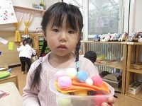 写真を見て、「これ作りたい!」など友だちと話をしながら自分の好きなフェルトやポンポンを選んで重ねたり、巻いたり、容器に詰めたりしています。