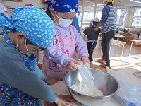 まずはきりん組が分量を量ってくれました。目盛りを真剣に見つめて、「ストップ!」と声をかけ合っていました。たまごを割る時は少し緊張しているようでしたが、「コンコンコン、パカッ」とつぶやきながら上手に出来ました。
