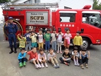 避難訓練の後には、水消火器を使って、実際に保育者が消火器の体験をしました。普段は見ることのできない消火の様子を見学したり、「〇〇せんせい、がんばれー!」と声援を送りながら見守る子どもたちでした。そして、子どもたちが楽しみにしていた消防車の見学の時間。各クラスごとに、写真を撮ったり、消防車のホースやハシゴを見せてもらったりなど、「すごーい!」「かっこいい!」などと子どもたちは大興奮でした。また、消防士さんの身に付けている無線で、実際に話をさせてもらえうこともできました。「あっちのコレ(もう1人の消防士さんの無線)から、こえきこえたでー!」と、友だち同士で盛り上がっていす姿もみられました。