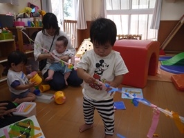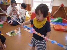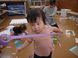 保育室にスズランテープを吊るすと、子どもたちから「ここに(シールを)貼ってみよう!」という声が上がり、ペタペタとシールを貼り始めました。