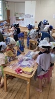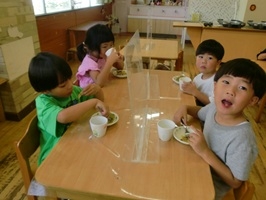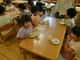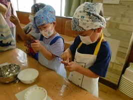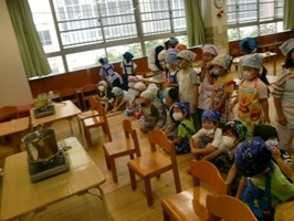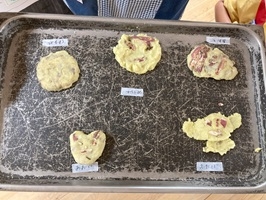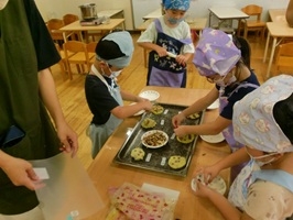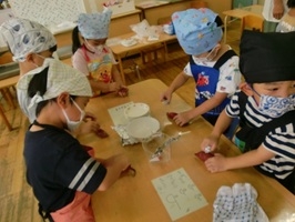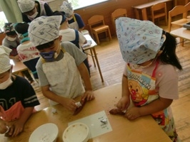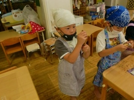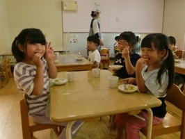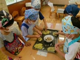 午後からはホットプレートで焼きます。「あれ、僕のだよ」「美味しくできるかな?」とワクワク!さぁ、おやつタイムです。お味はどうかな……。「おいしい!!」「あまい」「のびる」と大喜び!食感がちょっぴり山芋に似ていたようです。