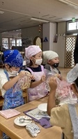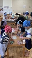 茹で上がると、一人ずつ袋にお芋を入れ、計量スプーンで砂糖・水・片栗粉を入れます。手つきはもう慣れたもの。袋の上から手の平で叩いたり、袋を持ってモミモミ。ペースト状になると手に取り、今度は丸めたり、ペッタンペッタンとせんべいの形にしていき、剥いた皮を使って模様や顔を作りました。