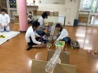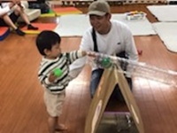 0歳りす組では、始めにクジを引きその質問に答えながら自己紹介をしてもらいました。『うちもそうです!』というようにうなずきながら聞いてくださいました。その後は子ども達の好きな転がしあそび、段ボールトンネル、箱車、ボール入れなどをして遊びました。少し緊張気味の子供たちでしたが普段からの遊びの継続を保護者の方と楽しむ事ができました。最後に大好きな「ぽんちんぱん」の絵本を読み、手を叩いたりしながら見るかわいらしい姿を見てもらえました。