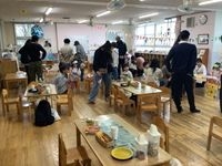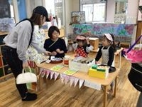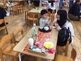 2歳あひる・ぺんぎん組では、子どもたちが作ったアイスやピザ、おにぎりなどを使ってお店屋さんごっこをしました。店員さんとお客さんに分かれて、保護者の方も一緒にやり取りを楽しみました。注文を受けると、大盛りにしたりおまけをつけてくれたりと大サービスでした。