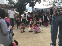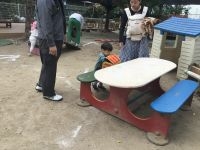 1歳うさぎ組では、同じく園庭で子ども達が大好きな「バナナ体操」や集団遊び「むっくりくまさん」をしました。いつもと違う雰囲気に保護者の方と離れられない姿も見られましたが、園庭遊びでは虫探し、電車ごっこ、砂遊びなど好きな遊びになると友だちと一緒に遊んでいました。普段の保育中のように楽しんでいる姿を見てもらうことができました。