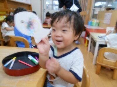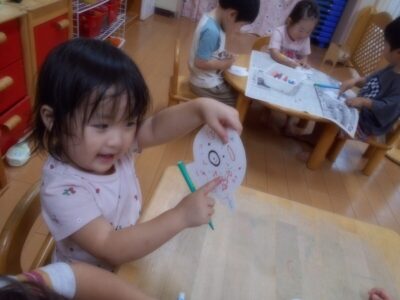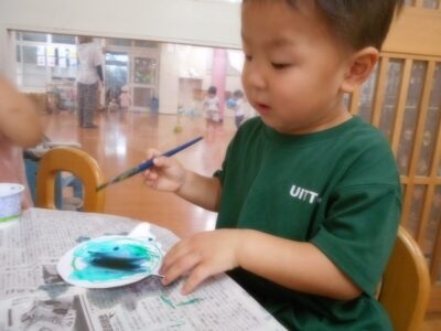 「あおいさかなができた!」「みて!これタコのくち!」と、子どもたちは何を描いたかを誇らしげに教えてくれました。