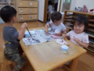 にじむ様子をじーっと見つめたり、色が混ざっていく様子を友だちと見せ合ったりと、その変化を楽しんでいました。
