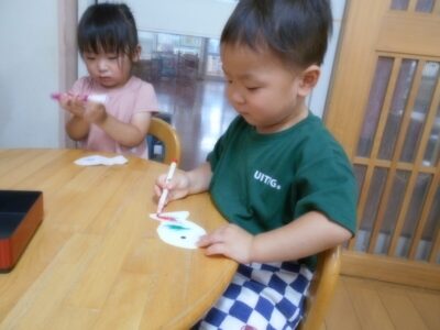 魚やタコなど、海の生き物の形をした画用紙に、まずは水性ペンで思い思いに模様を描きます。