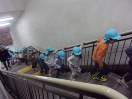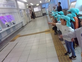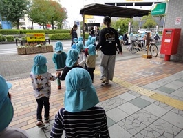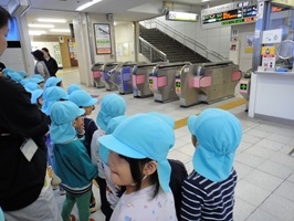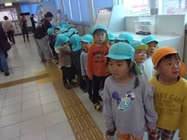 駅までみんなでお散歩に行きました。初めてのお散歩に、子どもたちは嬉しくて仕方がない様子!友達としっかり手をつなぎ、道路を渡るときは左右を確認しながら歩きました。