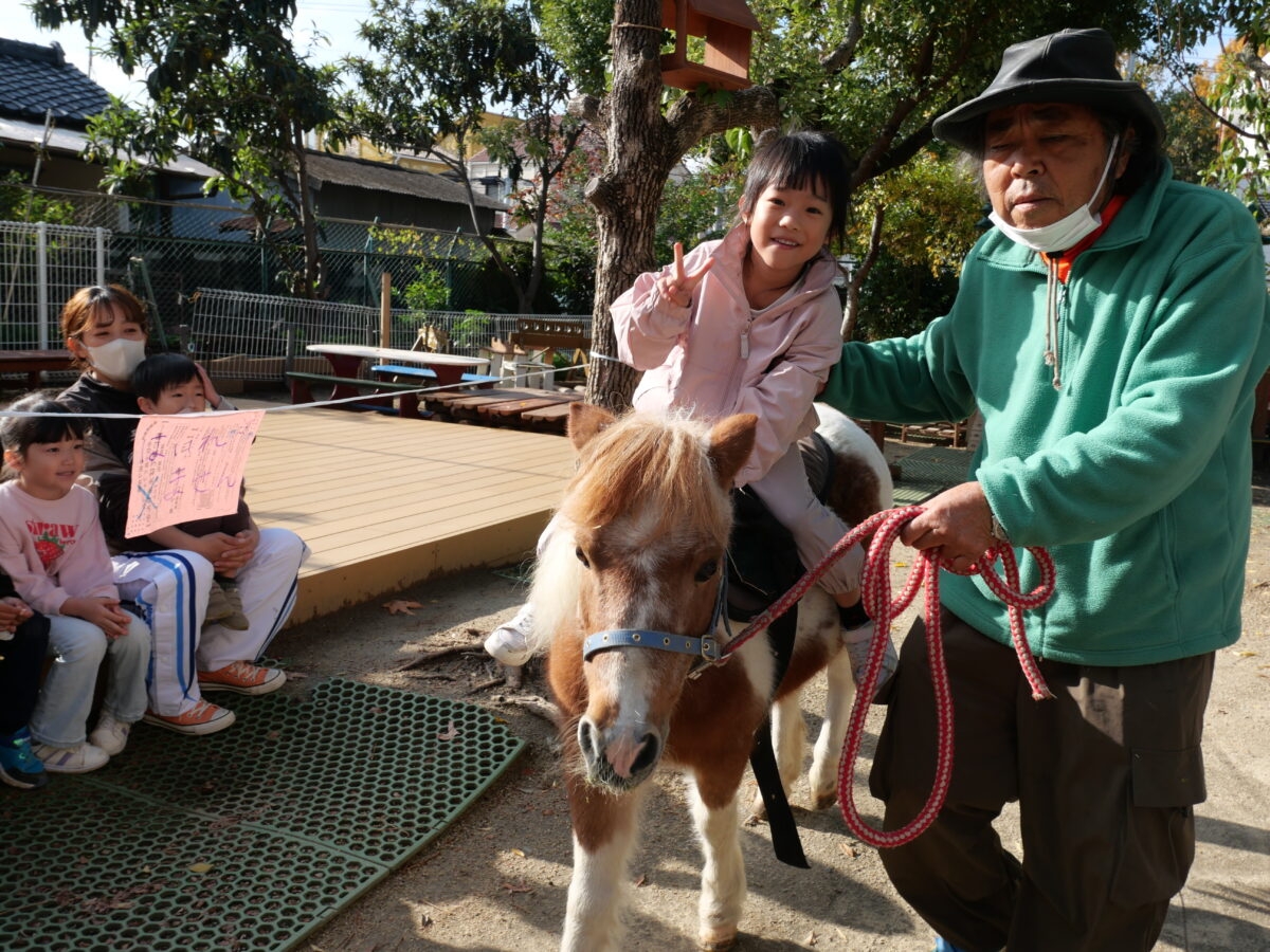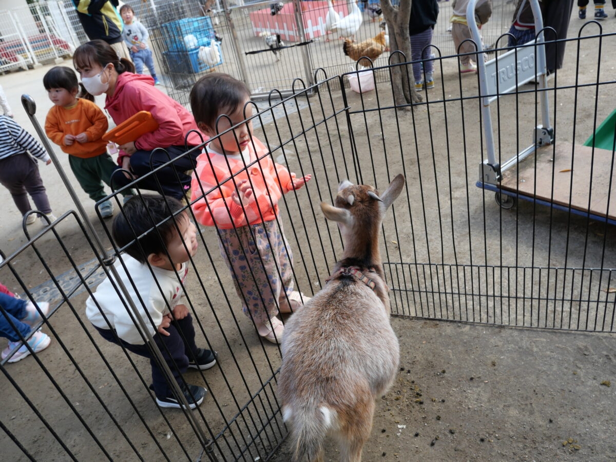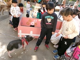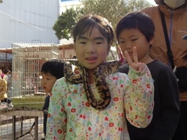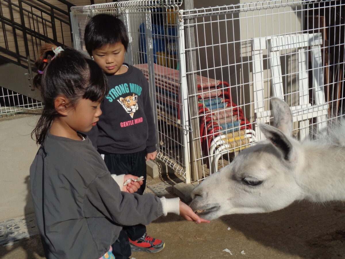 ラマやヤギの餌やりでは、最初は恐る恐る手を伸ばしていましたが、5歳児になると慣れた手つきで上手にあげていて、動物たちも食べやすそうでした。今年も長い長いヘビを首や腕に巻いてもらい、得意そうな子ども達の姿が見られました。