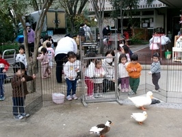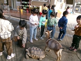 同じ背丈のガチョウにちょっぴり追いかけられたり、丸まっているヘビの顔を覗いていると急にニュ~っと伸びてきて、ビックリして思わず後ずさりする姿もありました。お喋りが上手なオウムは、子ども達が通ると「おはよ」「こんにちは」と声をかけ、「えっ!喋った!」と興味津々の様子でした。