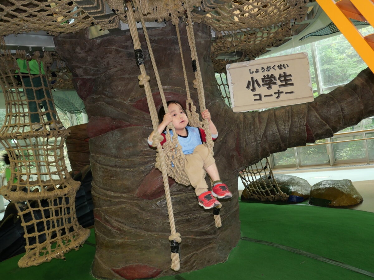 電車に乗ってビッグバンに到着すると、それぞれが行きたいアスレチックや滑り台へ元気よく走っていきました。保育者が思っていた以上に高い縄を登ったり、ジャンプしたりと、みんな意欲的に挑戦していました。