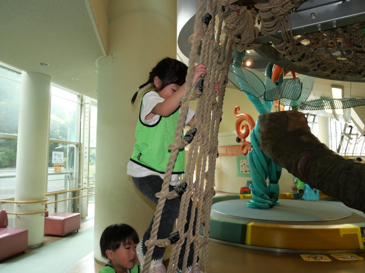 電車に乗ってビッグバンに到着すると、それぞれが行きたいアスレチックや滑り台へ元気よく走っていきました。保育者が思っていた以上に高い縄を登ったり、ジャンプしたりと、みんな意欲的に挑戦していました。