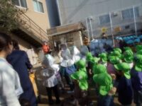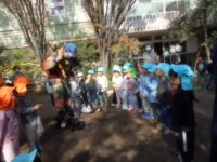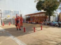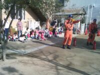 月一回の避難訓練を消防署の方の立ち合いのもとで行いました。いつものように、子どもたちは”ハンカチで鼻と口をおさえて!あるいて!”を守り、