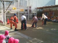 避難訓練の後には、水消火器を使って実際に保育者が消火器の体験をしました。普段は見ることのできない消火の様子を見学したり、「〇〇先生がんばれー!」と声援を送りながら見守る子どもたちでした。
