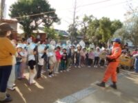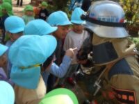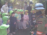 そして子どもたちが楽しみにしていた消防車。各クラスごとに写真を撮ったり、消防車のホースや梯子を見せてもらったりして、「すごい!」「かっこいい!」と子どもたちは大興奮でした。消防士の方に質問をしたり服を見せてもらったりもしました。