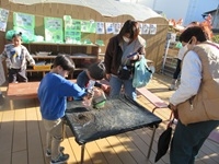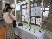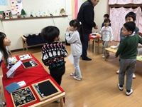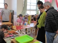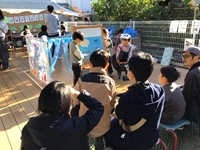 なりきりショーでは、好きな魚に変身して泳いだり特徴を発表したりしていました。「スイーツと花のお店屋さん」では、ドーナツやお花の実演販売を行い「かわいいね」「すごーい」とたくさん褒めてもらい嬉しそうな姿がありました。店員さんも照れながらも注文を聞き、色水遊びから発展したジュースなどをコップに注いでいました。「泥団子」は、子どもたちが作ったさら砂を触ってもらえるコーナーもあり、さらさら具合を感じていただけました。実物や作る様子の掲示物を熱心に見てくださる姿も。