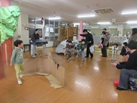 「虫あそび」は、リトミックやゲームを楽しみました。虫捕り網に変身して、子どもたちが変身した虫を捕まえにいってくれたお父さんお母さん。子どもたちも楽しそうに逃げ回っていました。「音・廃材あそび」は、廃材と風船を組み合わせた楽器や的当てを楽しみました。色々な音を鳴らしてみて音の違いを感じたり、的を狙って玉を飛ばして見せたりしていました。「うどん屋さん」では、オーダーを聞いたり麺の湯切りをしたりと店員になりきって楽しむ姿がありました。みんなに「おいしい!」と言ってもらい嬉しそうでした。