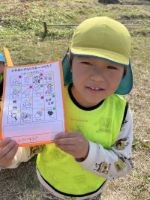 午後からは、午前中に見た物を振り返りながらフィールドビンゴを行いました。”鳥”の項目がありますが、「鳥の声は聞こえたけど、鳥は見えへんかった」という声が…。それでは、鳥がよくいる場所に行ってみよう!小さな川が流れている静かな場所に行き、双眼鏡を使って鳥の観察を行いました。「鳥見えた!」「めっちゃ大きく見える!」と嬉しそうな子ども達でした!