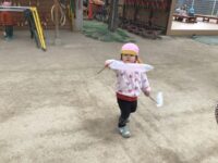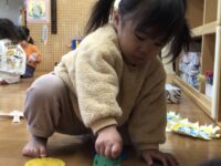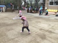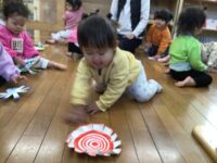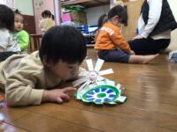 別の日にはコマ遊びをしました。一歳児さんも自分で回しやすい手作りのコマをクルクル回して遊んでいました!