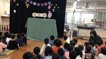 保育者から「おおきくなるっていうことは」のペープサートを見て、大きくなるって体が大きくなることや、小さい子や友だちに優しくする心が大きくなることなど1つ上の