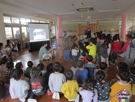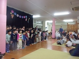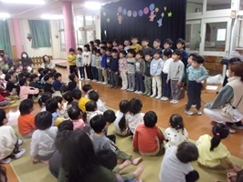 3,4,5歳からは進級したらこんな楽しいことがあるよと教えてもらいました。「ぱんだ組(3歳児)になるとお散歩に行ったり、お話会に参加できるよ」「きりん組(4歳児)になるとクッキングやイングリッシュ」「らいおん組は(5歳児)になるとふれあいの森やデイキャンプ、和太鼓などができるよ」とスライドを見ながら「新しいクラスもおもしろそうだなぁ」と期待を持っている様子でした。