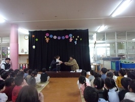 保育者から「おおきくなるっていうことは」のペープサートを見て、大きくなるって体が大きくなることや、小さい子や友だちに優しくする心が大きくなることなど1つ上の