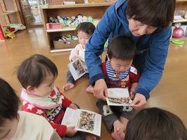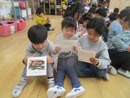 保育室に戻ってから担任保育者から「おもいで」の証書をもらいました。クラスの写真を見ながら「〇〇ちゃんいるね」と友だちの名前を言ったり、少し照れながら証書を受け取ったり、「何て書いてるんだろうね」友だちと先生からのメッセージを読む姿も見られました。