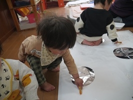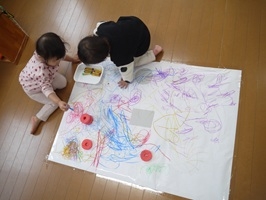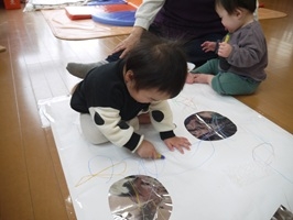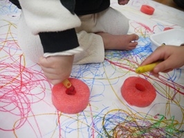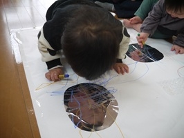 顔を映してみたり、スポンジの中にクレパスを入れて描いたりと