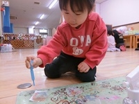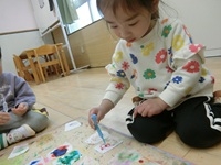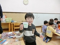 次の日、折り紙でストローを作りコップににじみ絵を貼ると完成♪自分で作ったのがお気に入りなようで何度も見に来ては「これ○○の」という姿もありましたよ。