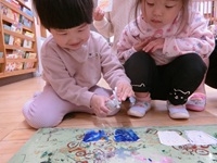 活動の前日に子ども達に「明日はみんなでジュースを作ろう!」と言うと「わあ!やったー!」と大喜び。お家から「リンゴ味にするねん!」と何味にするか考えてきている子どももいました。ペンの色選びでは好きな色をすぐに手に取る子どもや、味を意識した色を選ぶ子どもがいて様々でした。「これはブルーベリー味やで」と知っている果物を自信満々に教えてくれる姿もありました。水をスポイドで垂らしたり、霧吹きで吹きかけたりするとインクが滲むということは初めに伝えていなかったため、子どもたちは驚いていました。紙に色がじゅわっと広がる様子をじーーーっと眺め「すごいなあ」「こんなに青がいっぱいになった!」「ほんとうのジュースみたい」と感じたことを保育者や友だちに話していました。