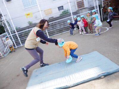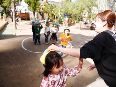 トップ > お知らせ > 鬼の見ていない間に・・・3歳児ぱんだ組 園からのお知らせ 2026.04.09 ブログ 鬼の見ていない間に・・・3歳児ぱんだ組 帽子取り鬼ごっこをしました。鬼に捕まってしまったら、帽子を取られてしまいますが、お友だちが取り返してくれたら復活できます。でも取りに行ったところを狙われて、捕まってしまう子どもが多くいました。繰り返し遊んでいる中で、助けたいけど、どうしたらいいのかな・・・と考えて、鬼が見ていない反対側から隙を付いて、帽子を取り返していました。鬼の動きをよく見るのがコツだと気付いていました。 new old