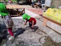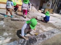 太筆やローラー(ペンキ塗り用)を使い乾いたコンクリートに絵を描きました。