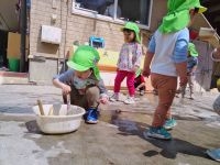 水を浸けてトントンコロコロすると色が変わることが楽しい!両手に持って周りを塗ったり、お尻を浮かして後ろ向きで歩きながら長~い線を描いたり。